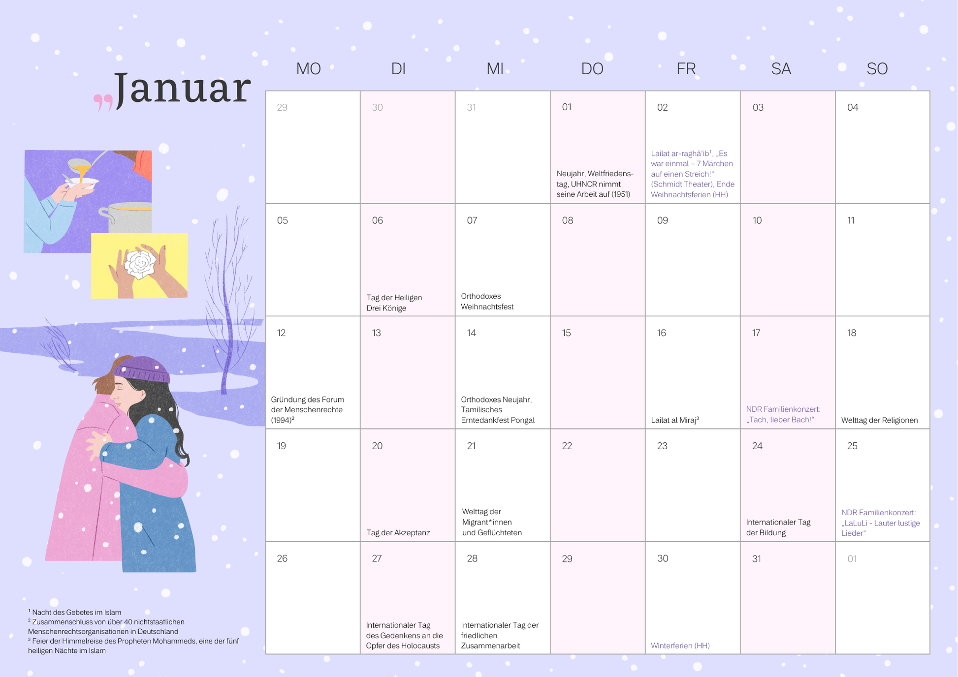 Der Kalender zeigt, wie bunt Hamburg ist, und lädt dazu ein, gemeinsam zu feiern, zu erinnern und voneinander zu lernen. Denn Zusammenhalt beginnt dort, wo wir unsere Geschichten teilen – als Nachbar*innen, Freund*innen und Familien.